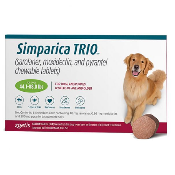 Buy Simparica Trio once-a-month triple protection from flea-tick, heartworms, and intestinal worms for your canine friend. PetCareClub offers up to 60% Off with Free Shipping across the USA. Get Simparica Trio Green for Dogs 44.1-88 lbs at the lowest price online with huge discounts.